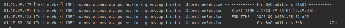 findByConditions 메소드에서 storeQueryRepository에 조회 결과를 요청하는 부분이 핵심 기능에 해당되고, 핵심기능 전.후의 현재시간을 이용해 실행시간을 계산하고 로그를 남기는 부분이 부가기능에 해당됩니다.
