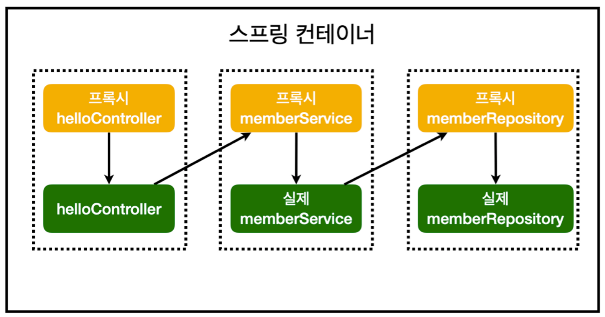 - 컨트롤러는 기능을 수행할 때, 프록시 객체를 호출하고, 프록시 객체가 실제 memberService 객체를 호출해 로직을 수행합니다.